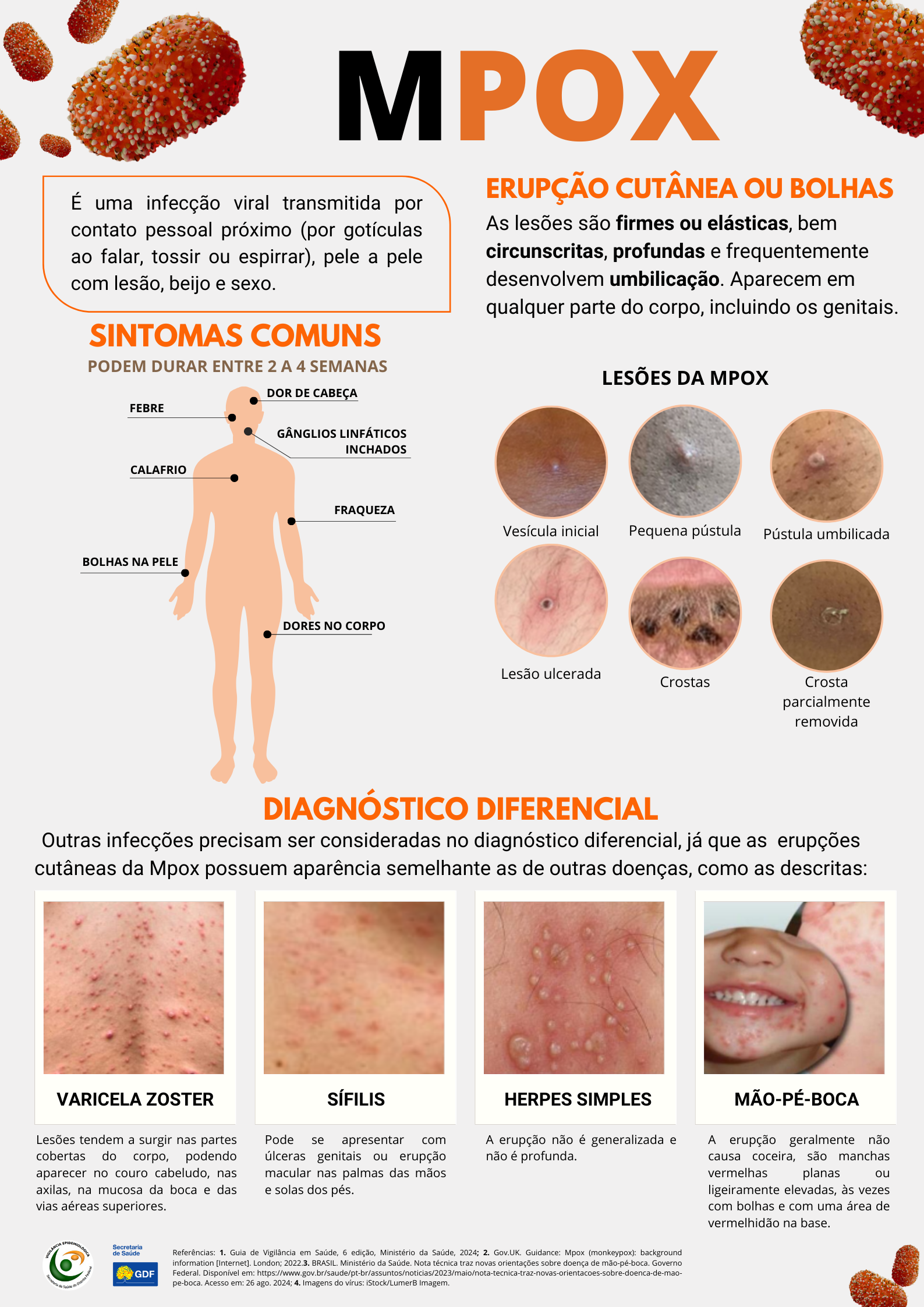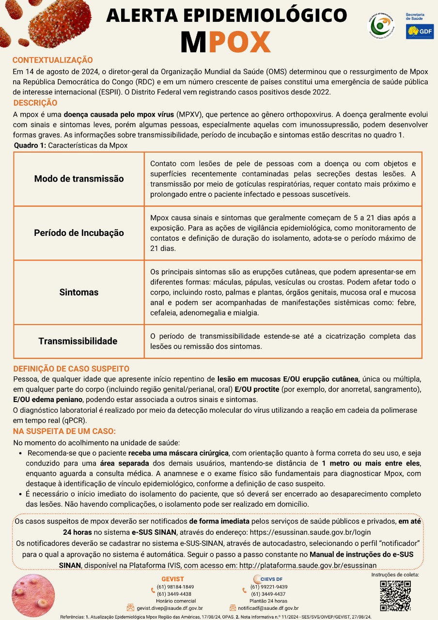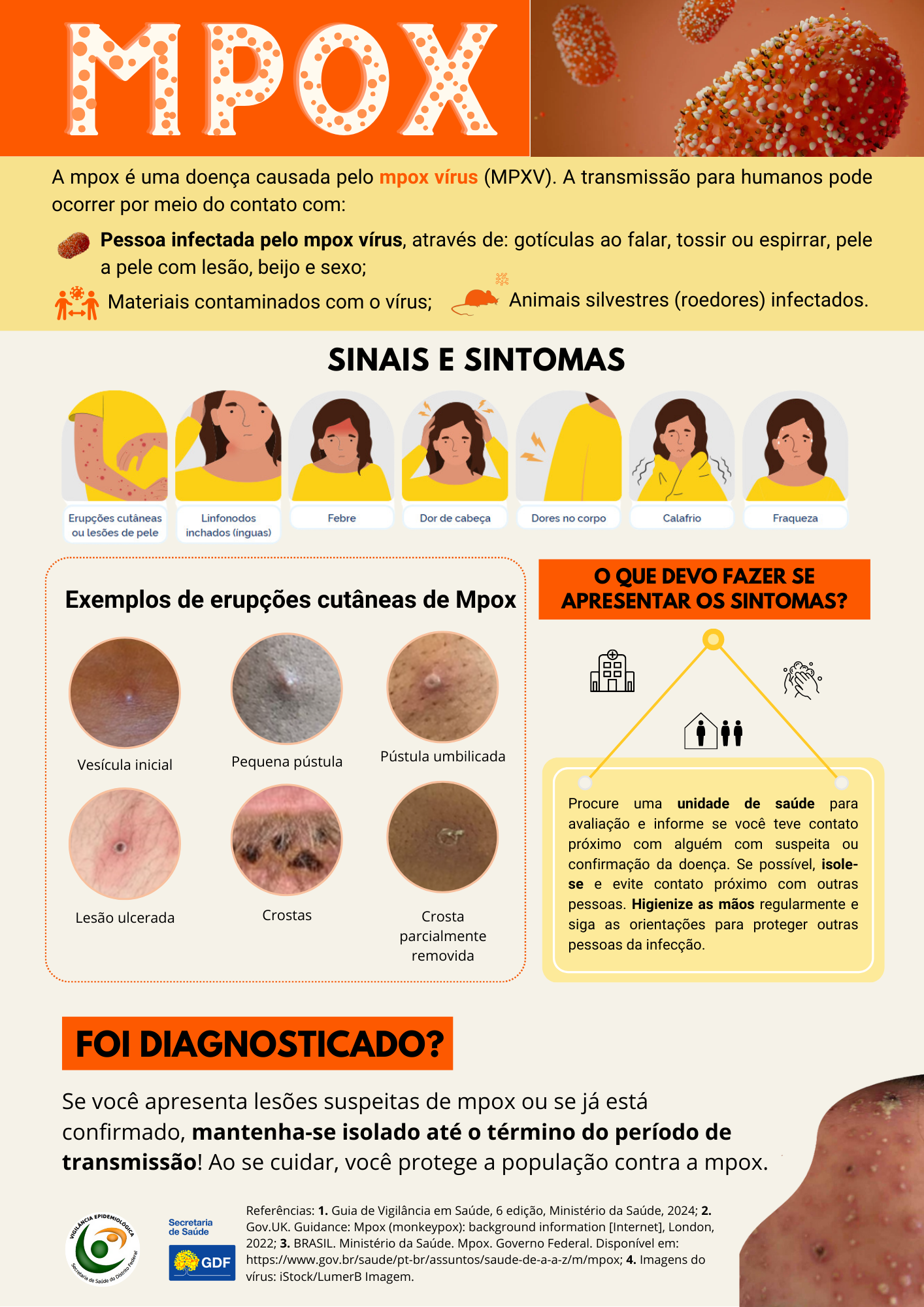 A mpox é uma doença viral causada pelo mpox vírus (MPXV), pertencente à família Poxviridae. Embora se trate, inicialmente, de uma zoonose, ou seja, uma doença que passa de animais para humanos, a transmissão entre pessoas é uma das principais preocupações. No Distrito Federal, o primeiro caso foi confirmado em julho de 2022, no contexto de uma emergência global devido à disseminação do vírus.