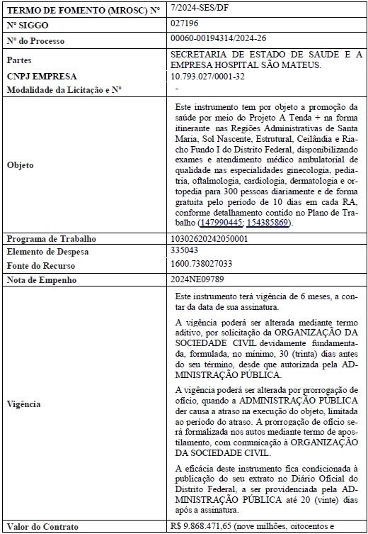 | 026838/2024 | Secretaria de Estado de Saúde do Distrito Federal e Instituto Instituto Brasileiro de Assistência à Saúde - IBRAS |
