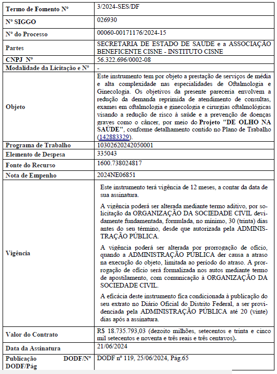 | 010/2024 | Secretaria de Estado de Saúde do Distrito Federal e Instituto ELISEDAPE | ELISEDAPE 24.342.283/0001 -18 |