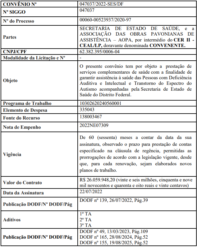 | 047037/2022 | Associação das Obras Pavonianas de Assistência - AOPA | ° 62.382.395/0006-04 | O presente convênio tem por objeto a prestação de serviços complementares de saúde com a finalidade de garantir assistência à saúde das Pessoas com Deficiência Auditiva e Intelectual e Transtorno do Espectro do Autismo acompanhadas pela Secretaria de Estado de Saúde do Distrito Federal. |