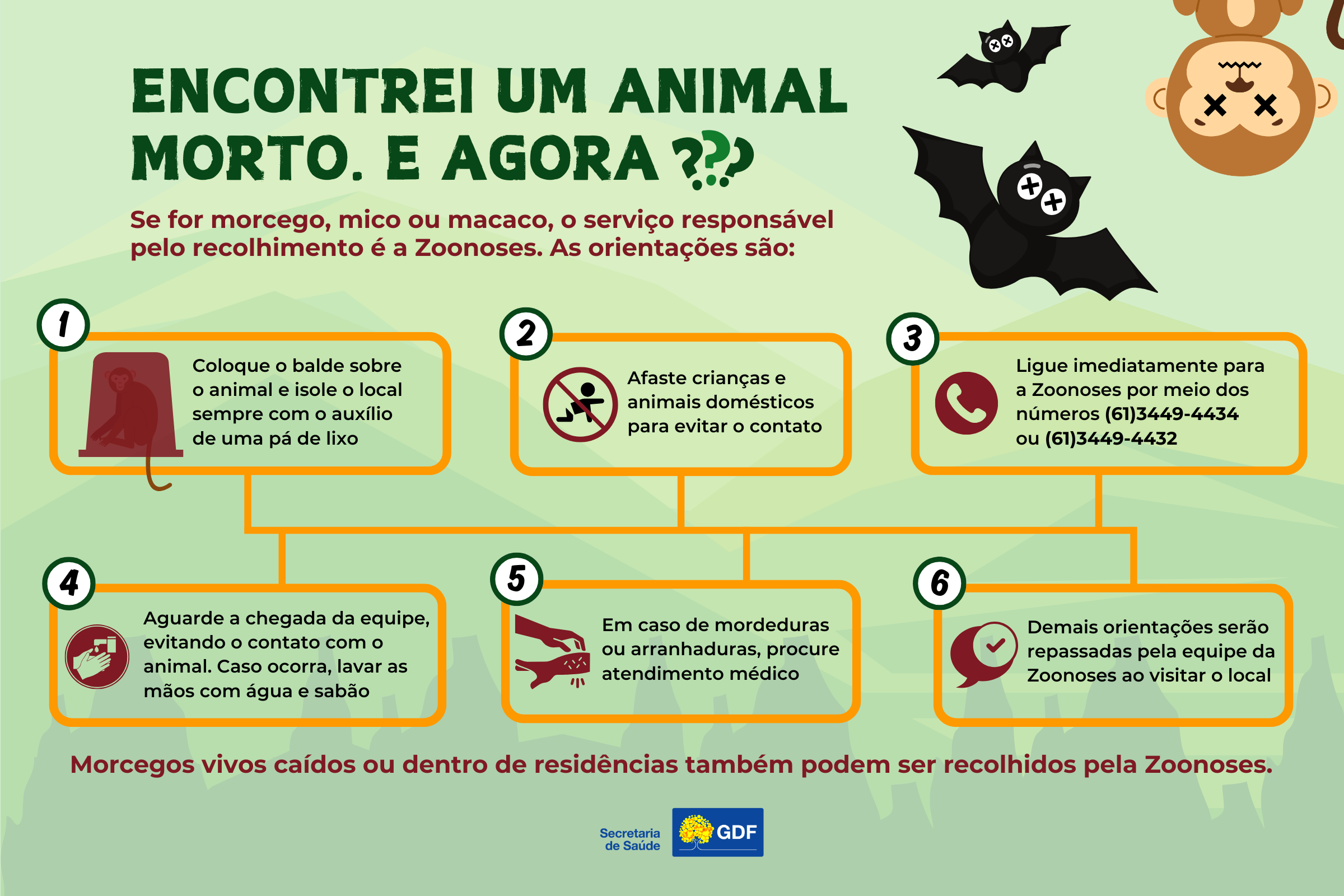 O diretor de Vigilância Ambiental da SES-DF, Edvar Schubach, destaca que a Zoonoses trabalha especificamente com animais já mortos (no caso específico de morcegos, podem ser recolhidos vivos). Para o resgate de outros animais vivos, é necessário acionar o Batalhão de Polícia Militar Ambiental (BPMA). Para falar com a Zoonoses, deve-se ligar para os números 3449-4432 ou 3449-4434.