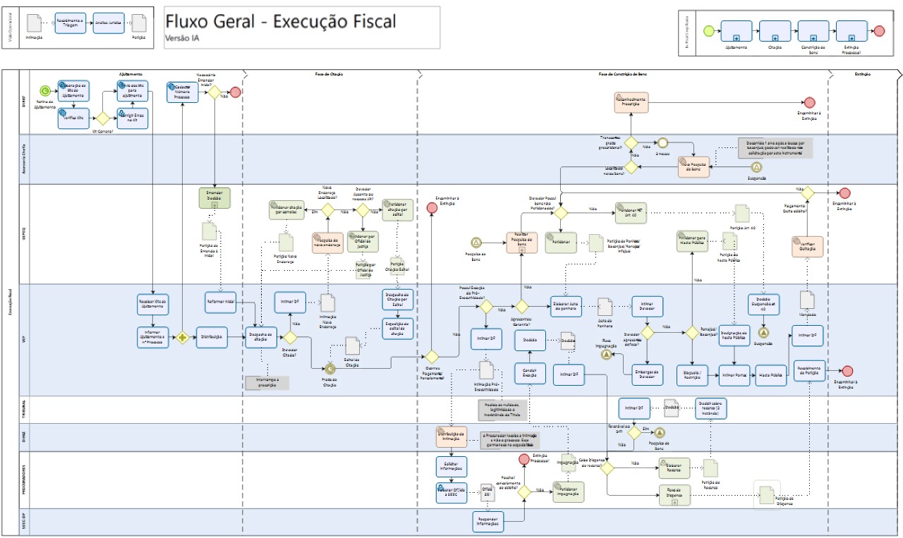 • Cenários – IA em Execução Fiscal – Em conjunto com o Fluxograma Geral de Execução Fiscal (acima), o documento Cenários permite a macro visão do processo judicial eletrônico de execução fiscal, com suas principais fases.