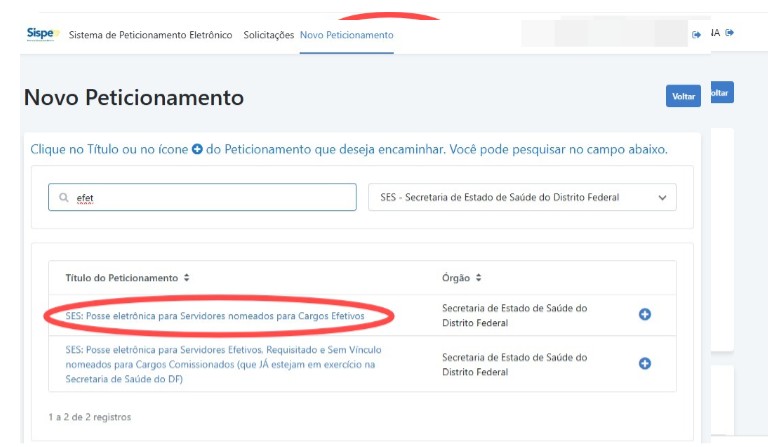 2.2) O segundo peticionamento (Peticionamento Eletrônico 2) é para que o nomeado insira no sistema SEI-GDF a documentação exigida.