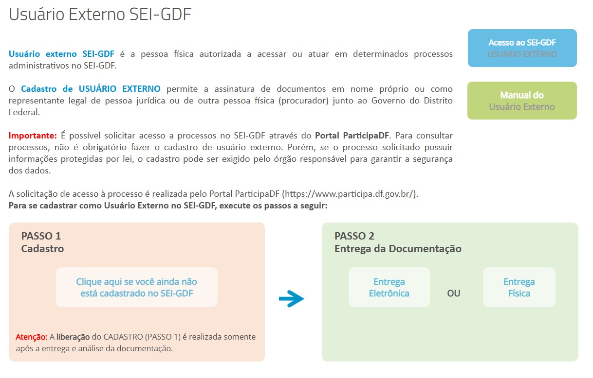 No caso de entrega física, será necessário comparecer pessoalmente nas unidades setoriais de gestão do SEI/GDF mais próxima (será listado quando for essa a opção) ou na Secretaria de Saúde, na GEPROG, com a documentação em mãos, para a liberação do acesso externo ao SEI.