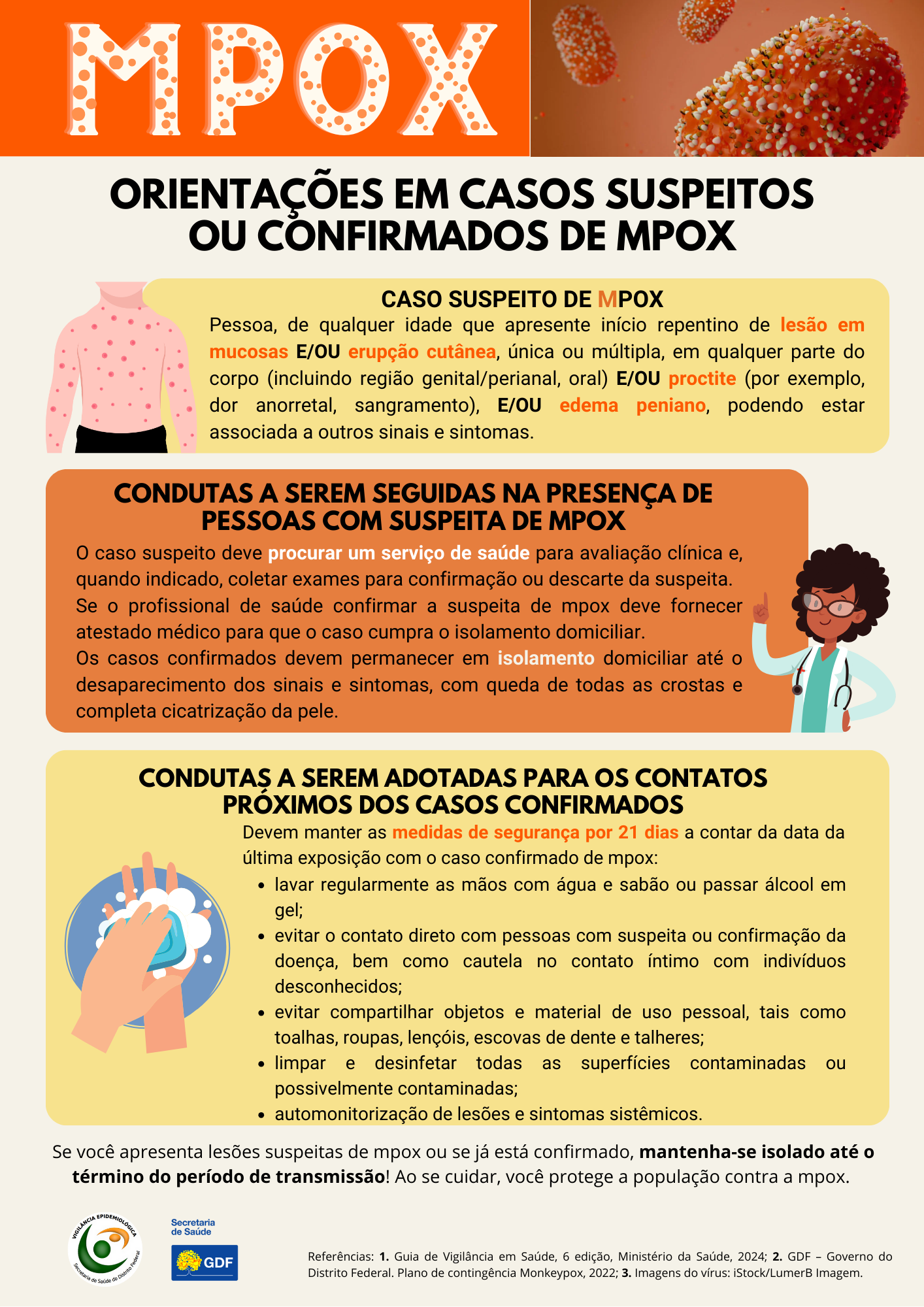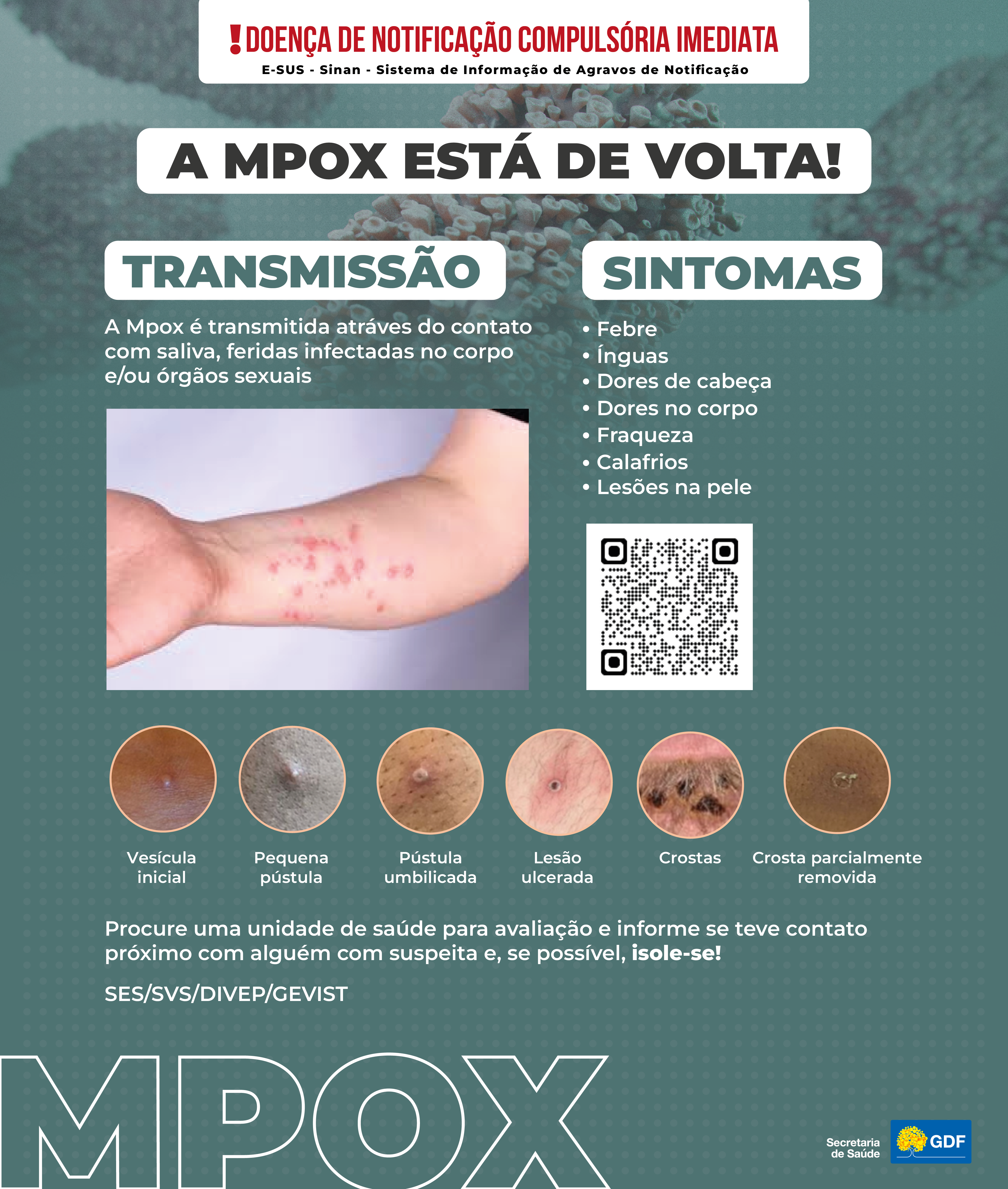 Se você apresentar sintomas compatíveis com a mpox, procure imediatamente uma unidade de saúde. No Distrito Federal, as Unidades Básicas de Saúde (UBSs) e as Unidades de Pronto Atendimento (UPAs) estão preparadas para receber e orientar pacientes com suspeita da doença.
