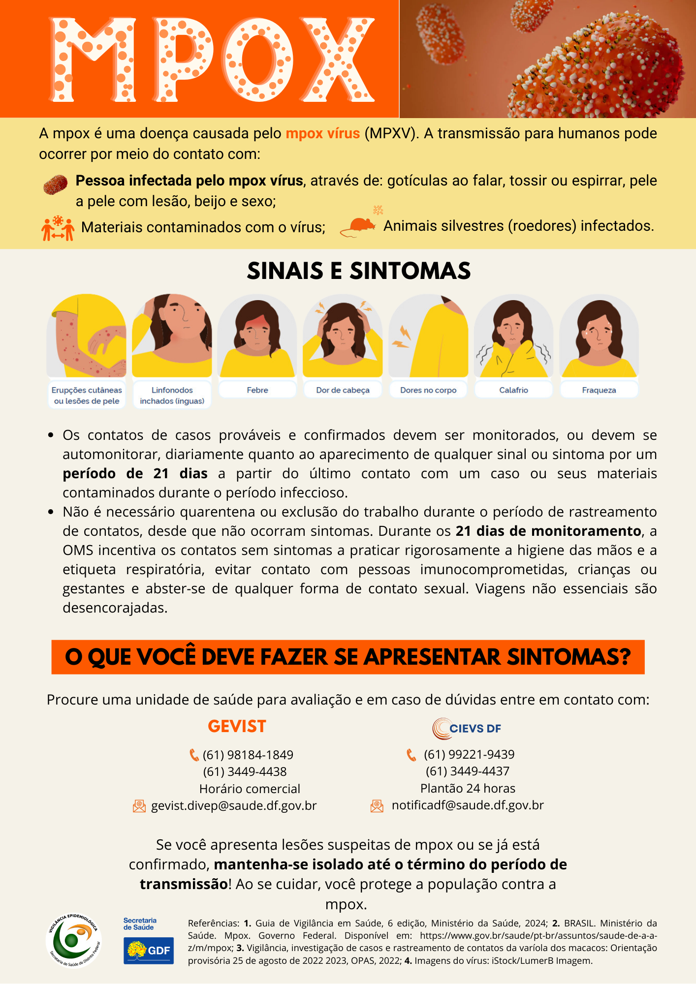 A mpox é uma doença viral causada pelo mpox vírus (MPXV), pertencente à família Poxviridae. Embora se trate, inicialmente, de uma zoonose, ou seja, uma doença que passa de animais para humanos, a transmissão entre pessoas é uma das principais preocupações. No Distrito Federal, o primeiro caso foi confirmado em julho de 2022, no contexto de uma emergência global devido à disseminação do vírus.