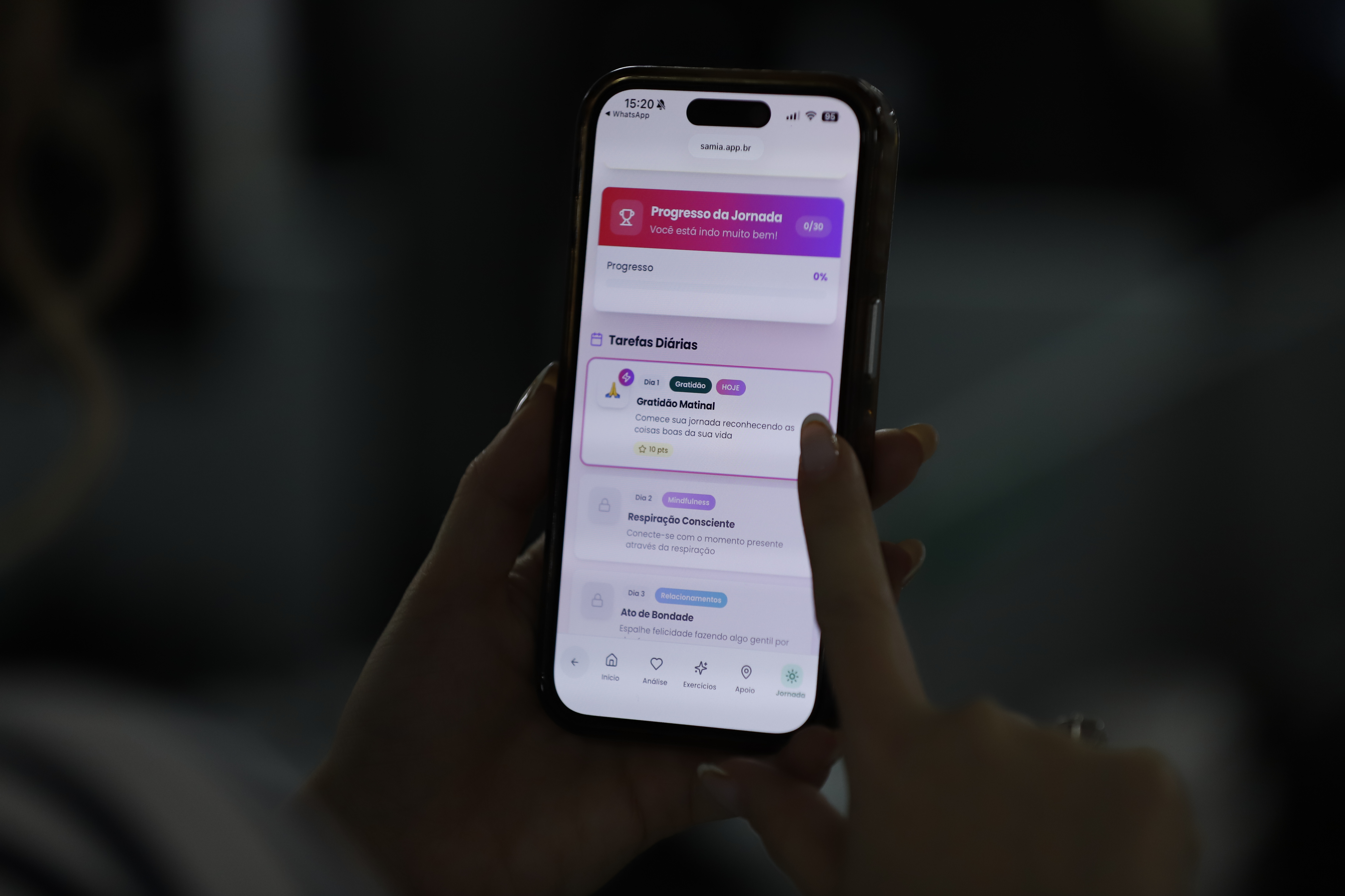Outro destaque da SAMia é a jornada da felicidade, recurso para incentivar o autocuidado no cotidiano. A proposta é realizar pequenas tarefas que demandam pouco tempo, mas contribuem para a sensação de bem-estar ao longo do dia. O ciclo tem duração de 30 dias e busca promover leveza, tranquilidade e melhora na qualidade de vida. Durante esse percurso, o usuário conta com o acompanhamento de um pet virtual, que evolui conforme o engajamento nas atividades.