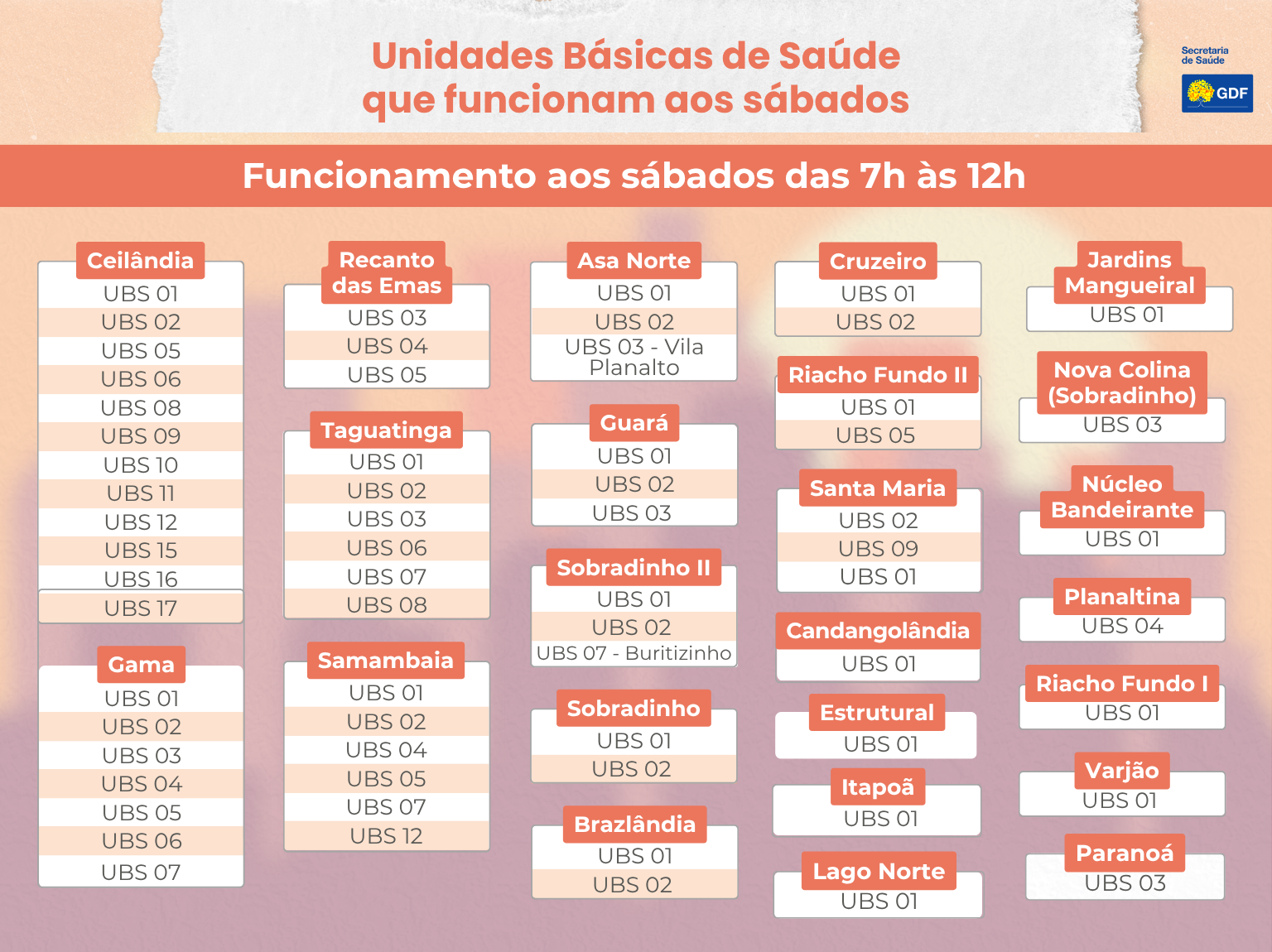 UBSs - As Unidades Básicas de Saúde não funcionarão na quinta (20) e sexta-feira (21). Já as unidades que abrem aos fins de semana, terão horário normal no sábado. Confira a lista abaixo.