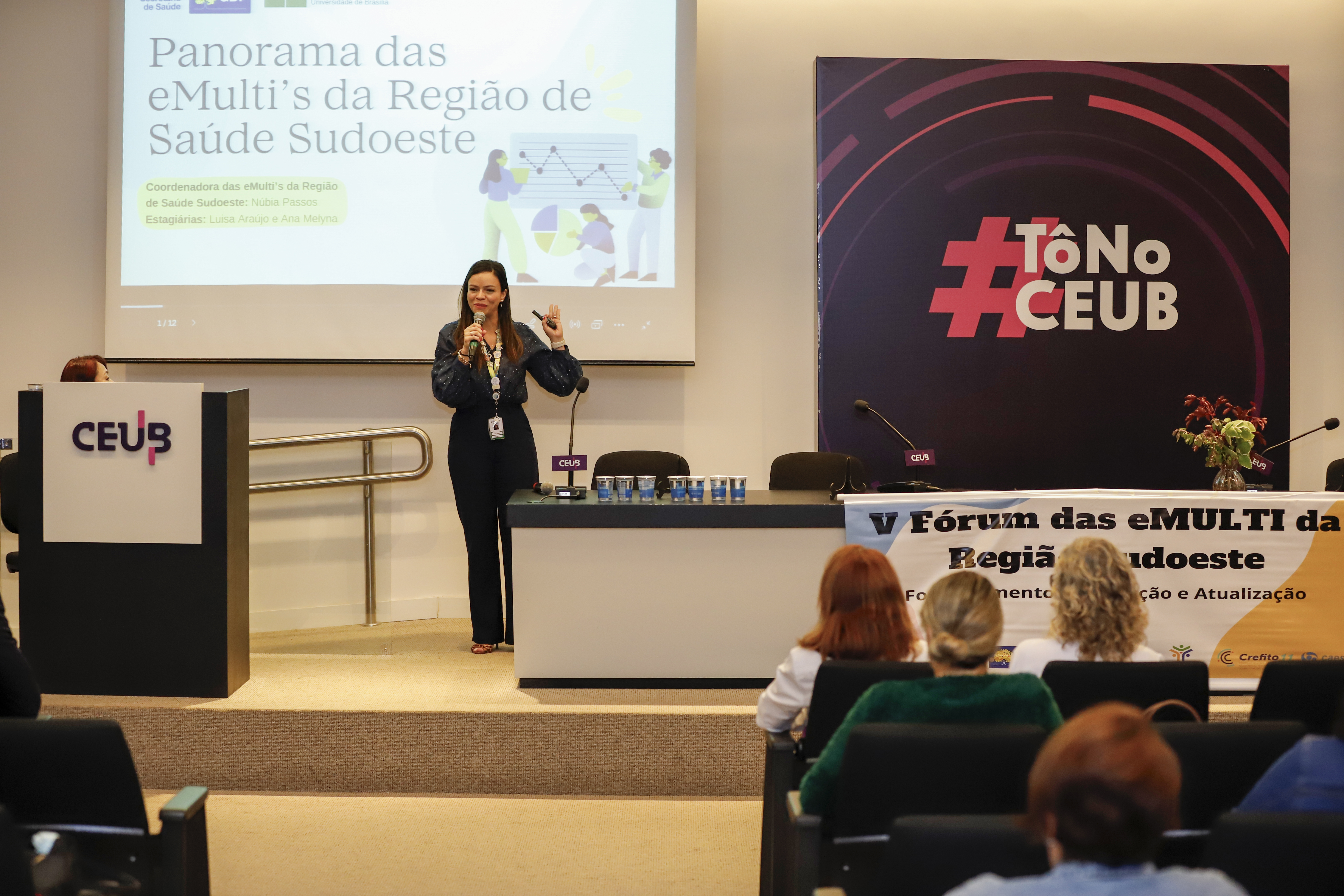 "O fórum é um espaço de escuta ativa, onde reforçamos o papel das eMultis dentro da Atenção Primária”, afirma a coordenadora do Comitê das eMultis da Região de Saúde Sudoeste, Núbia Passos. Foto: Jhonatan Cantarelle/Agência Saúde DF